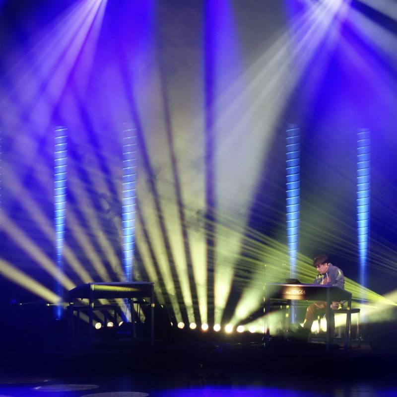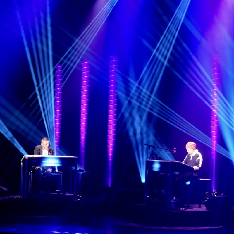 ステージ上に並ぶ2台のエレクトーンに奏者のシルエット・・・深く沈むドラムビートの後、激しいロックのビートで始まったオープニングは“ うっせぇわ ”。ロックギターで煽る富岡さんに鷹野さんが返す激しいサウンドバトル、人気曲集Adoのアレンジャー本人によるノンストッププレイがスタート!!